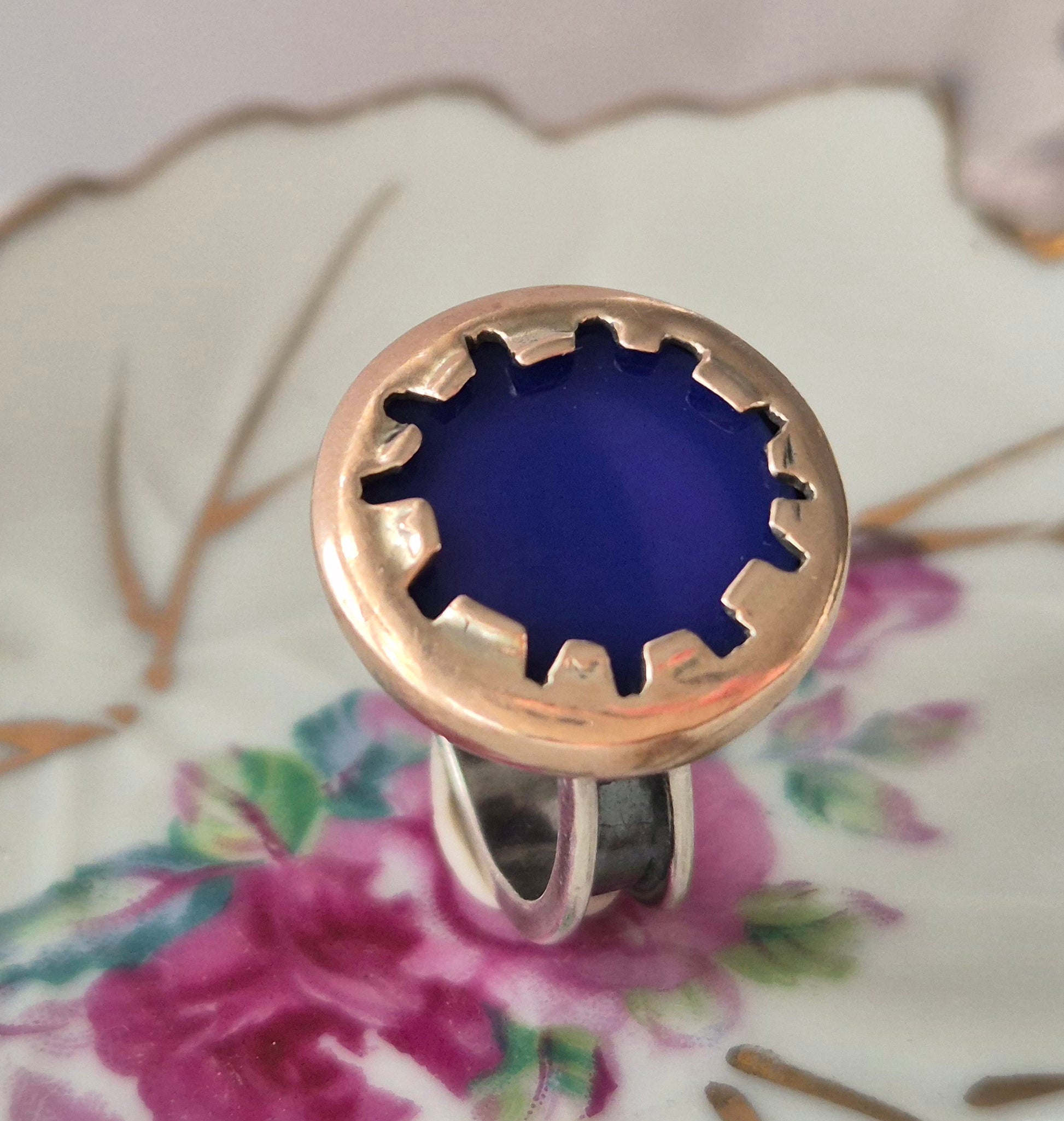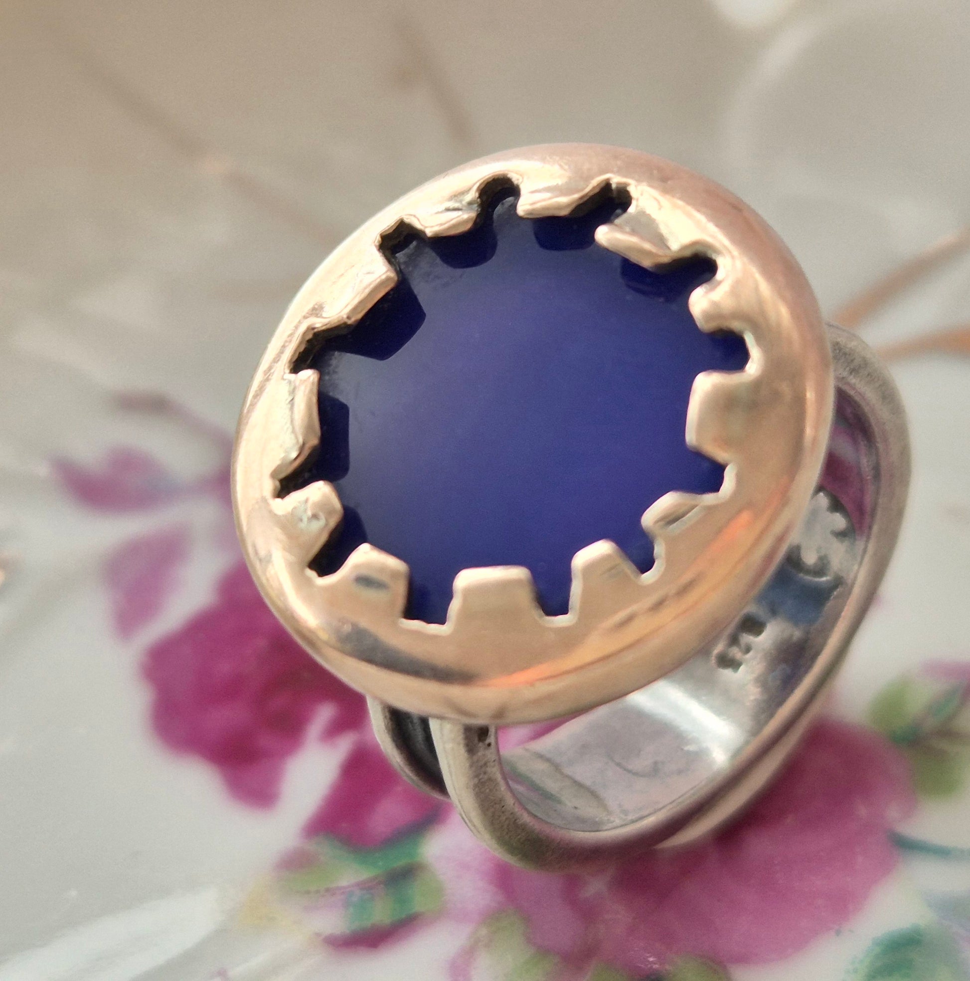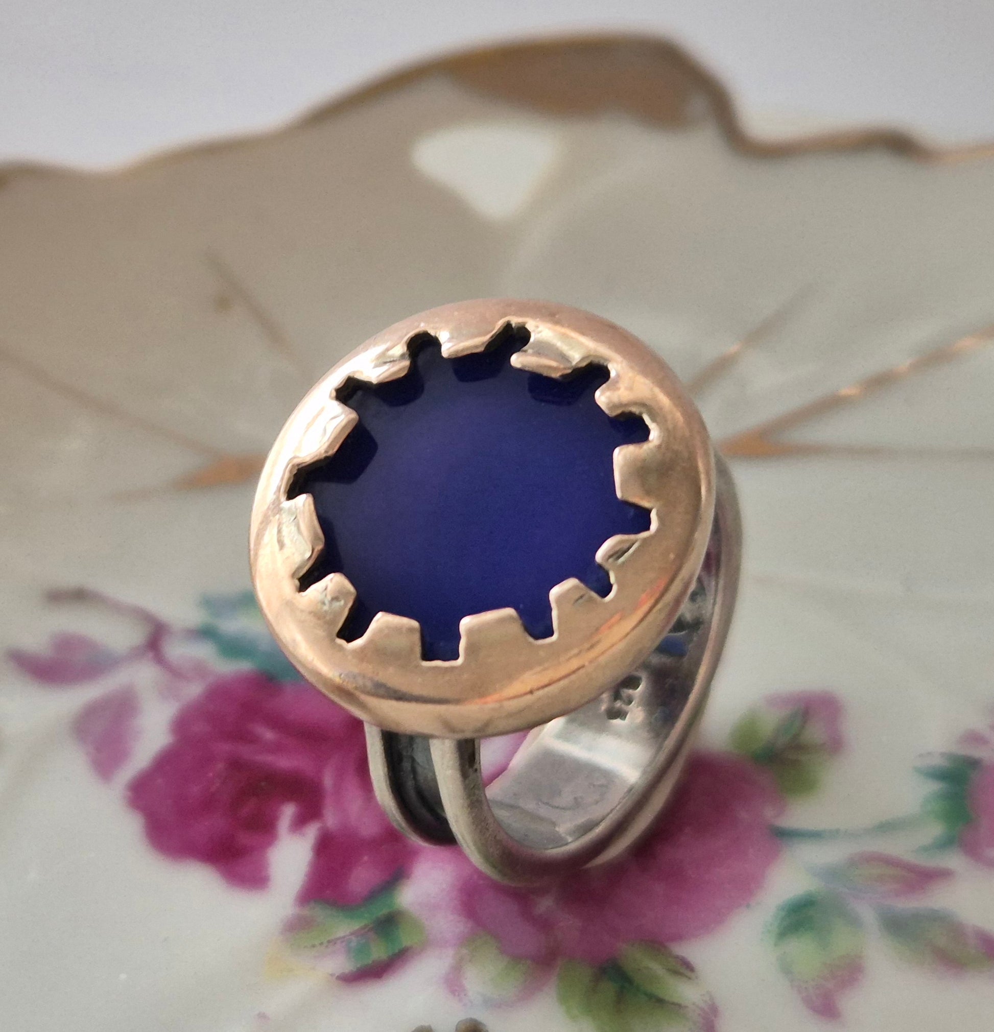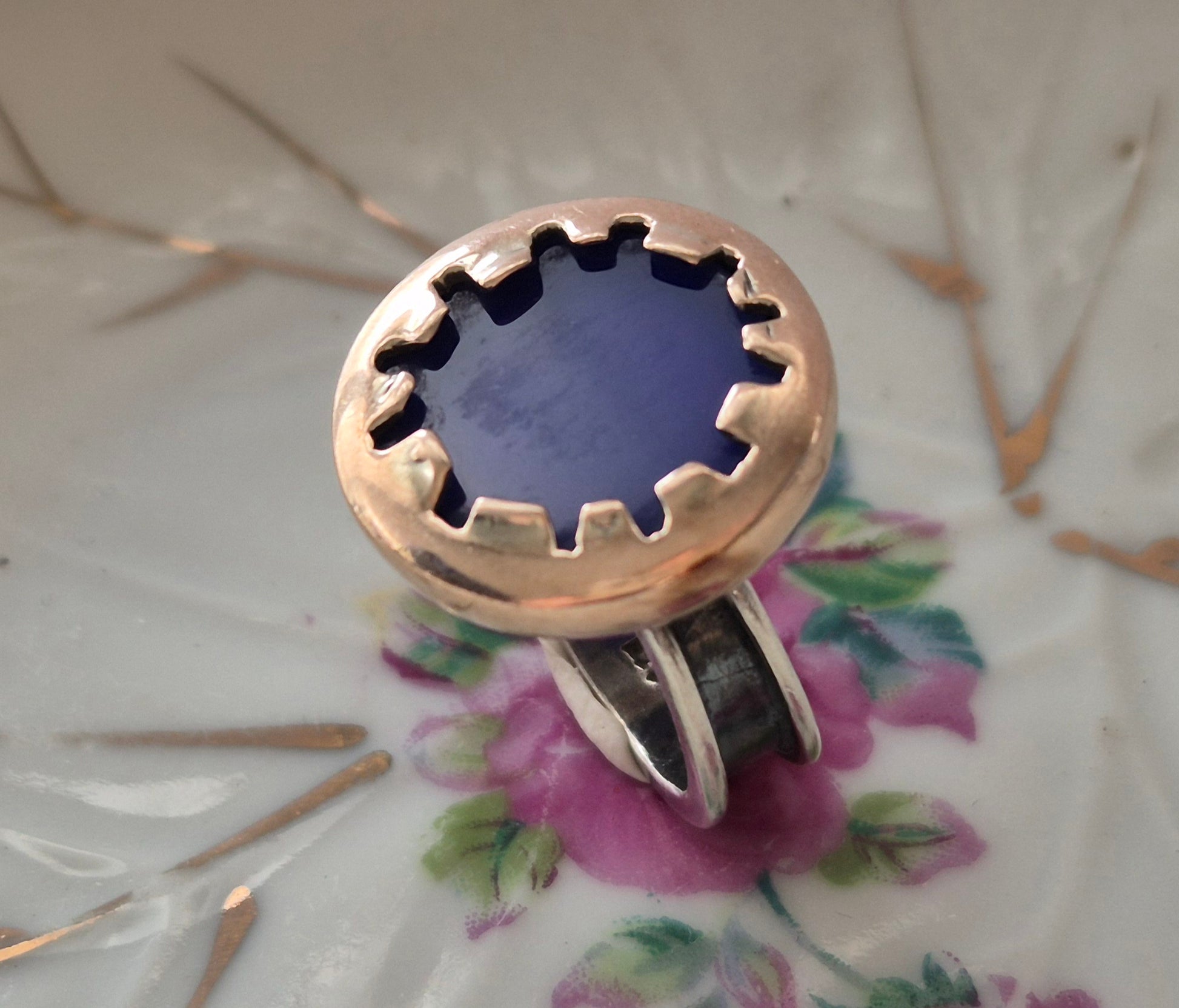 טבעת כסף(925) בית אבן זהב 14 קארט ואבן לאפיס כחולה.